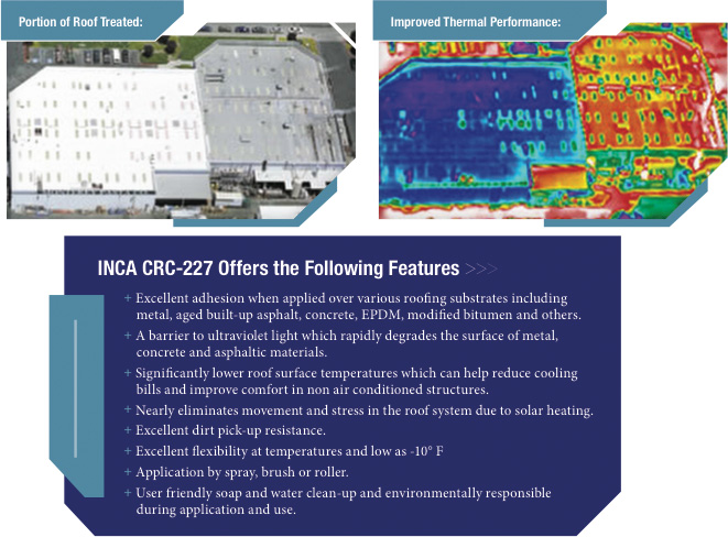 INCA CRC-227 radiant heat neutralizing membrane is a single component, water based acrylic elastomeric. This roof material incorporates heat dissipating properties to provide a neutralizing barrier against solar heat gain in the summer and preventing some heat loss from inside the structure during the winter.